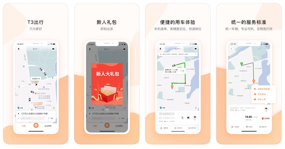 今天上线,对应的 app 也现已推出。T3 出即将从南京起步,本年将会进入南京、重庆、武汉、广州、杭州、天津这 6 个城市,2020 年将掩盖绝大多数省会城市。