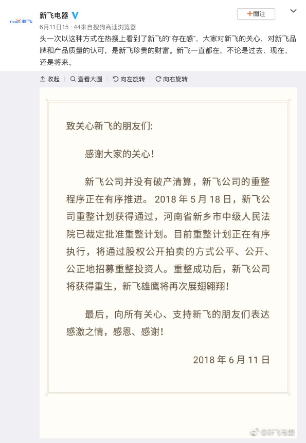 我国家电品牌新飞电器 6 月 11 日经过微博回应了此前有关公司行将破产清算的音讯,新飞表明公司并没有破产清算,重整程序正在有序推动,将经过股权揭露拍卖的方法公正、揭露、公正地招募重整投资人。